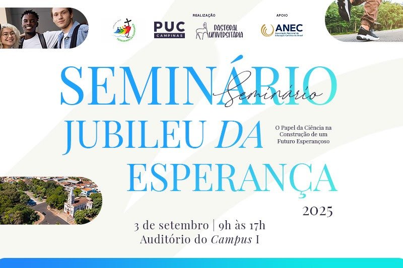 A Pastoral Universitária da PUC Campinas vai realizar no dia 3 de setembro, das 9h às 17h, no auditório do Campus 1, o Seminário Jubileu da Esperança 2025, com o tema: “O papel da Ciência na Construção de um Futuro Esperançoso”.